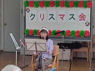 最初に皆さんでクリスマスソングを合唱し、続いて梁田千慈子氏のウインドシンセサイザーによる演奏が披露され、澄んだ音色に思わず耳を傾けるひとときに。 そして参加者一人ひとりへクリスマスプレゼントを手渡しました。